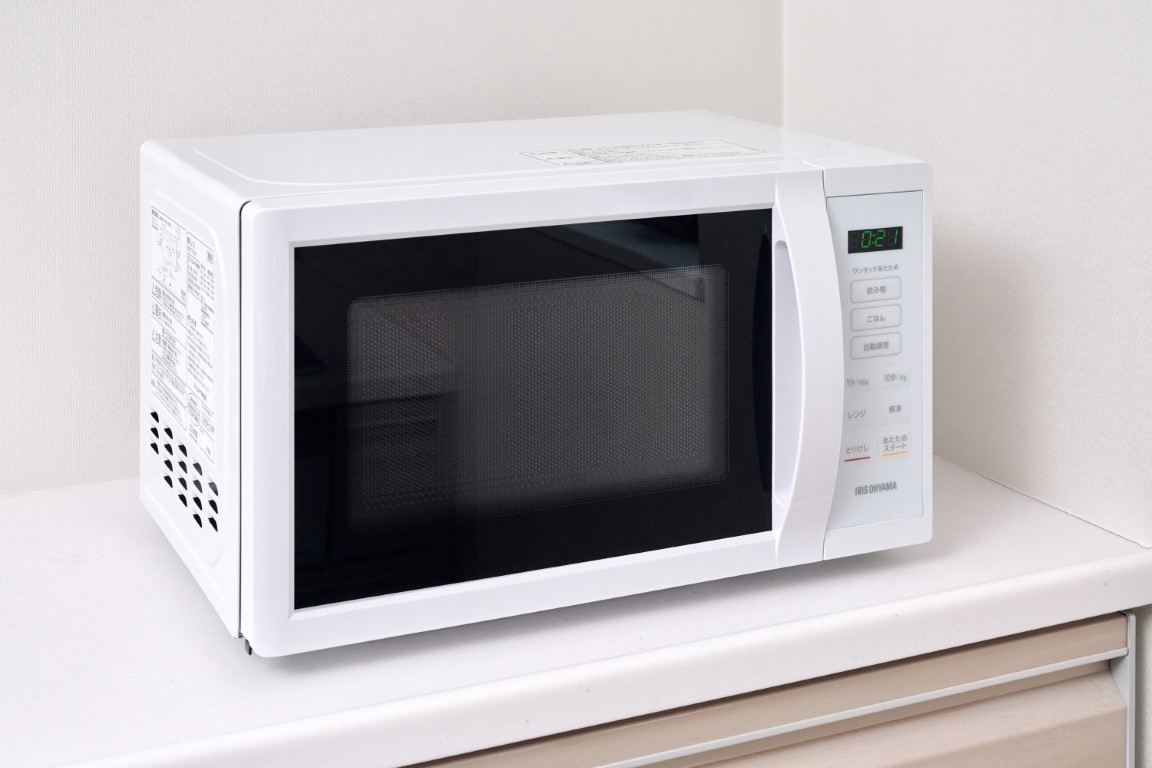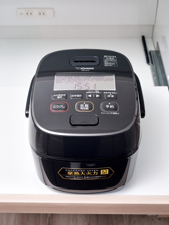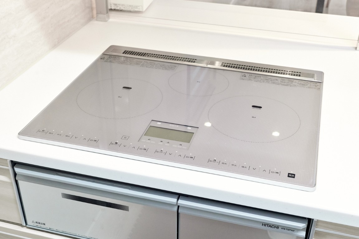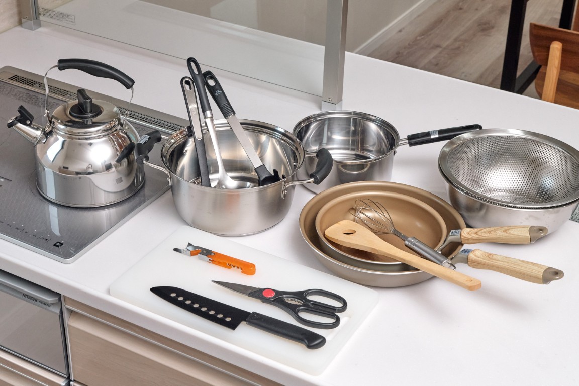 3口IHコンロ、電子レンジ・トースター、湯沸かしポット・炊飯器、おたま・鍋・フライパン、まな板・包丁
